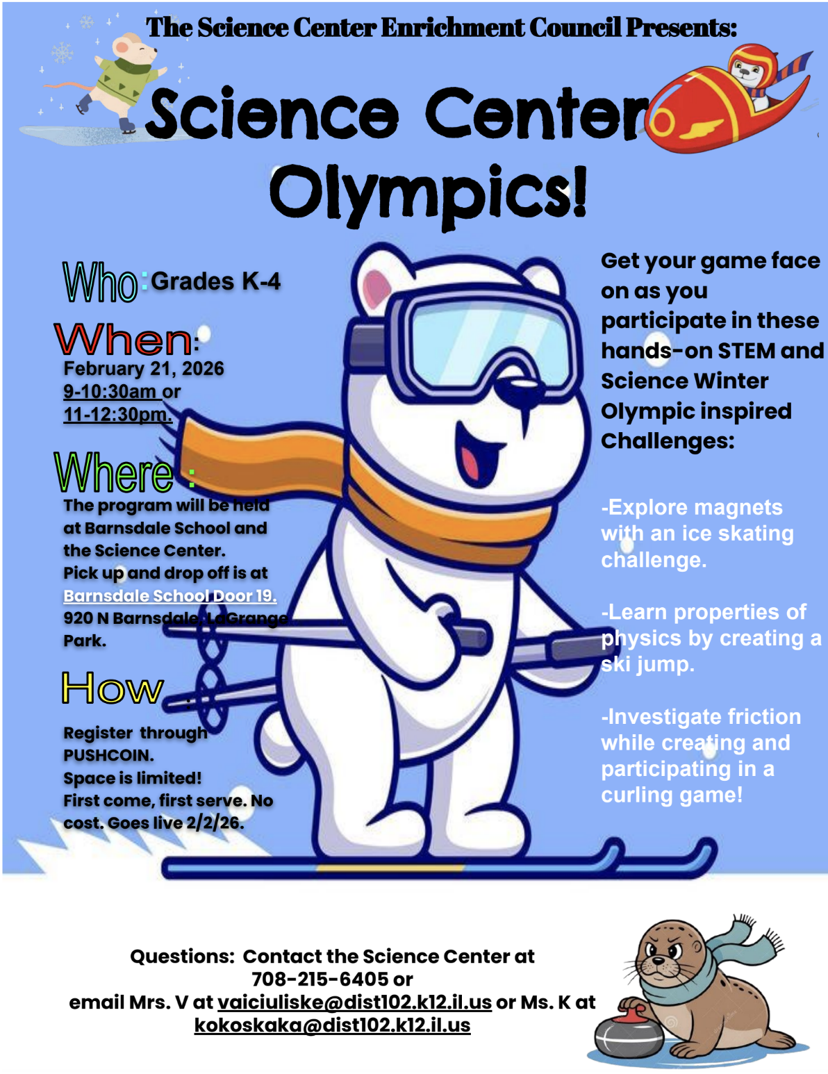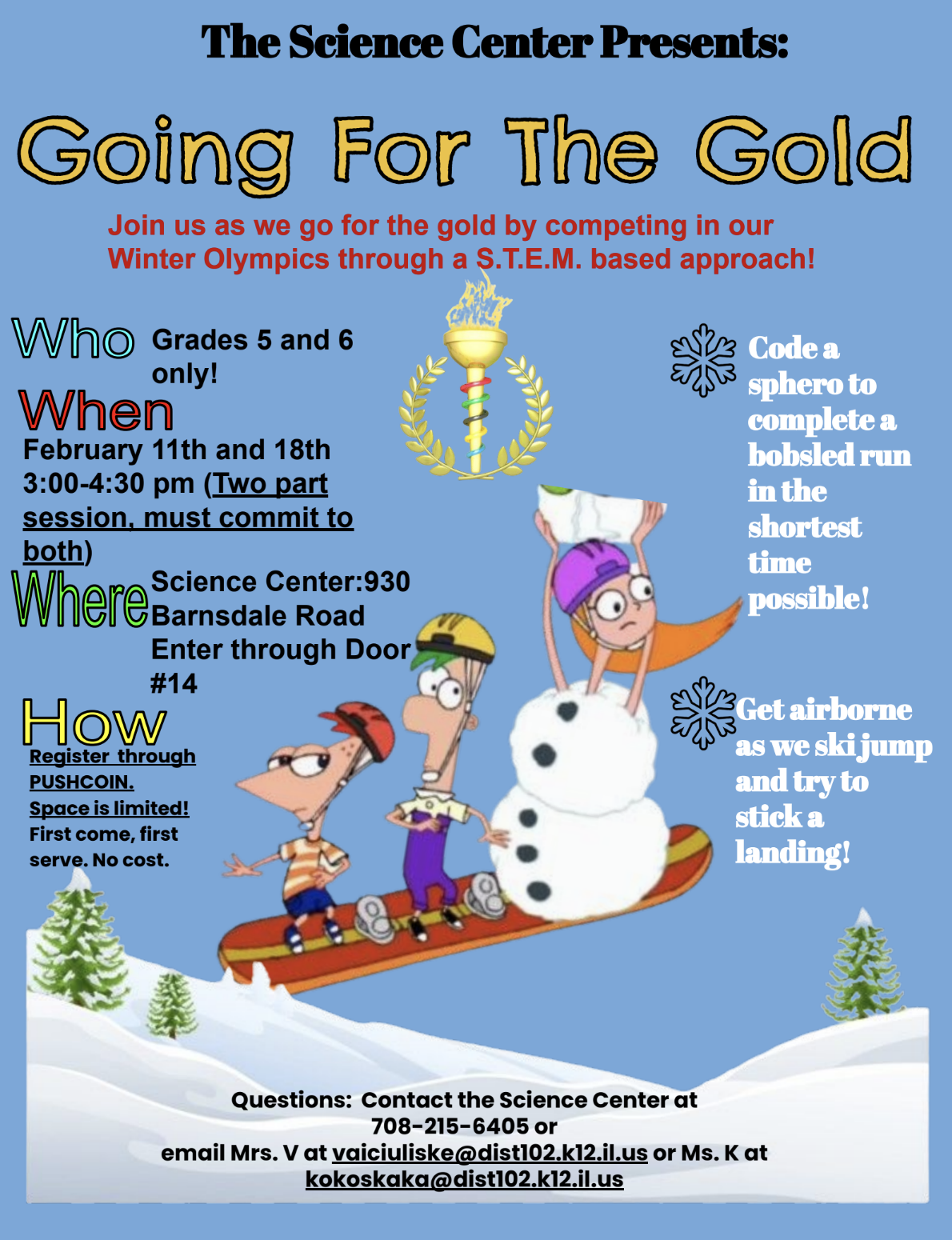 Get your game face on as you participate in these hands-on STEM and Science Winter Olympic-inspired challenges! Morning and Afternoon sessions are available. |