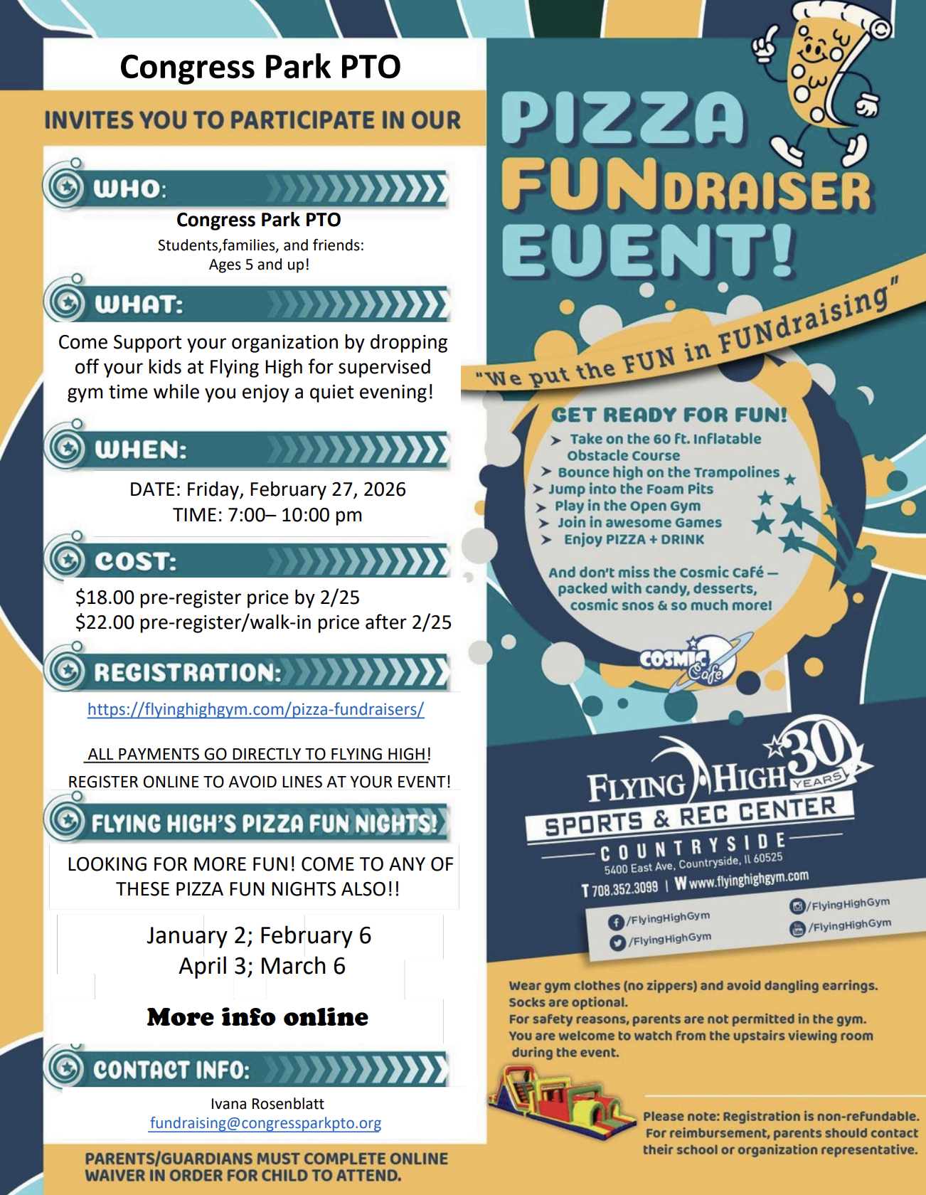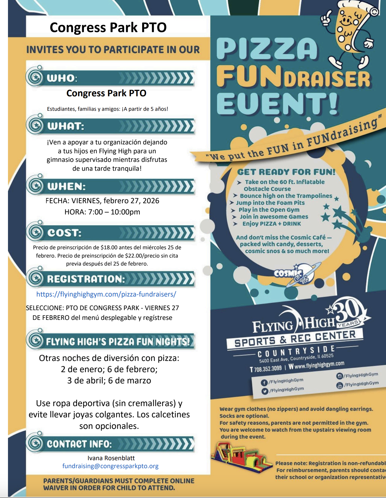 | 2/21 - Cultural Night 2/26. - 2026-27 Kindergarten Parent Info Night 2/27 - PTO Flying High Kids Night 3/7 - Cossitt Clothing Sale |