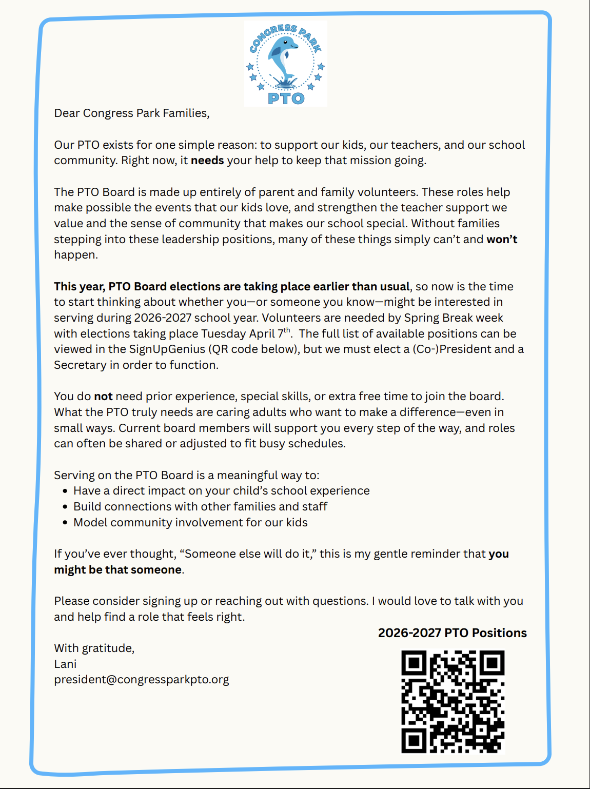 What a hardworking week! Thank you for visiting with me today at Coffee with the Principal. I’m looking forward to seeing you volunteer to fill our PTO positions! We hope you have a restful and enjoyable weekend with your loved ones. As we look ahead to Monday, please help ensure students come to school ready to learn by getting a good night’s rest and arriving on time.