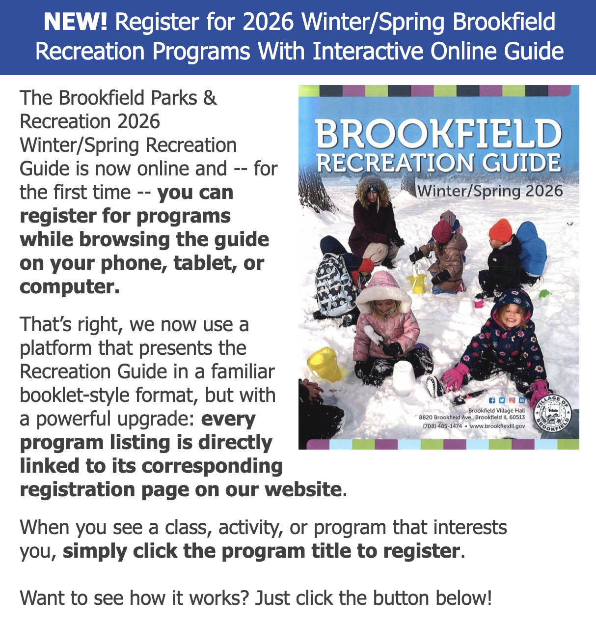 There are two program locations: • The Water Tower – 3840 Maple Ave. • The Rec House – 4301 Elm Ave. Families can register in person at the Parks & Rec Offices (lower level of Village Hall, 8820 Brookfield) or online by clicking the button below.