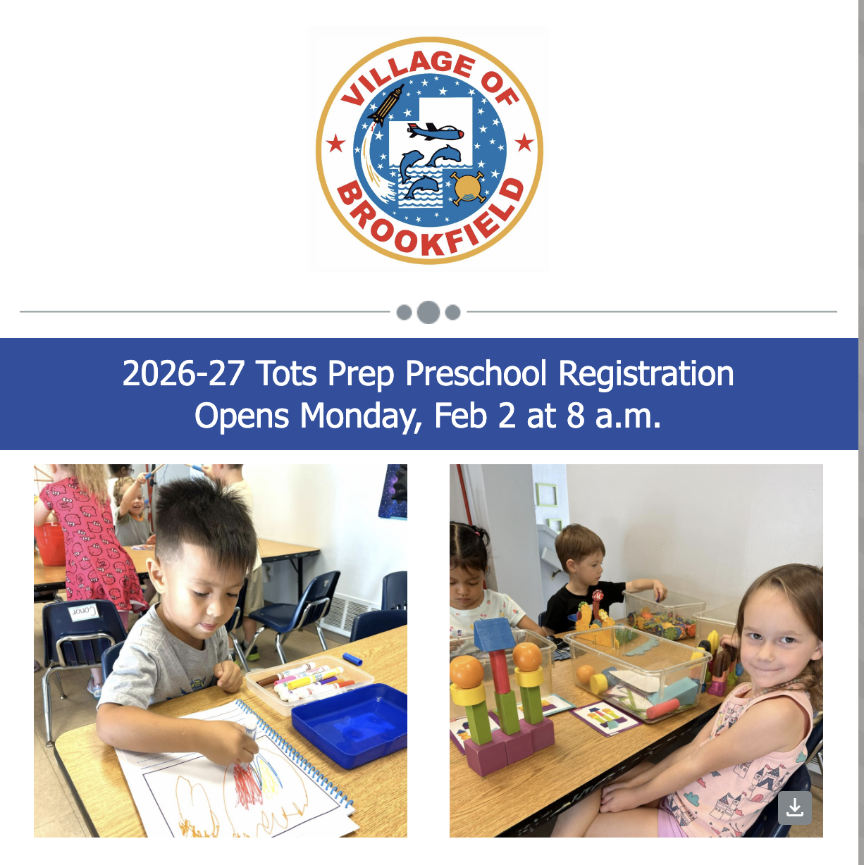 Registration for Brookfield Parks & Recreation's 2026–27 Tots Prep Preschool Programs opens Monday, Feb. 2 at 8 a.m.